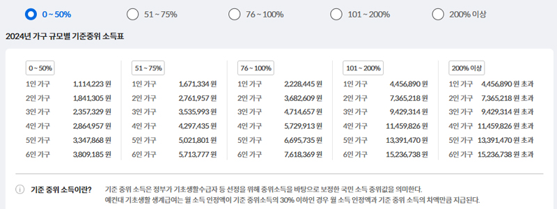 기준 중위 소득은 매년 보건복지부에서 고시하며, 가구원 수에 따라 다르게 적용됩니다.