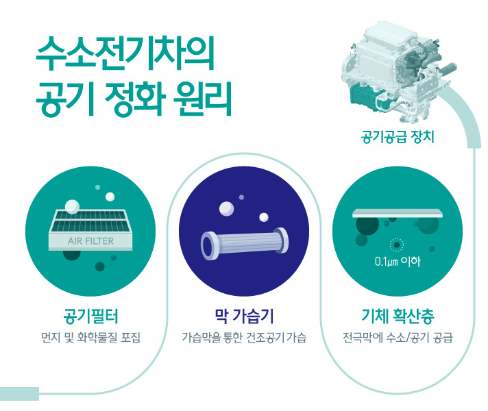 외부 공기에서 산소를 수집하는 시스템 수소전기차는 외부 공기에서 산소를 수집하여 연료전지 스택에 공급합니다.