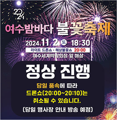 여수 불꽃축제는 단순히 불꽃놀이만 있는 것이 아닙니다. 다양한 프로그램이 준비되어 있어 관람객들이 즐길 수 있는 요소가 많습니다. 올해의 불꽃축제는 2024년 11월 02일 (토) 오후 6시 30분 부터 21시 20분까지 진행되며, 불꽃놀이 외에도 다양한 공연이 예정되어 있습니다. 특히, 8시부터는 특별한 라이브 공연이 펼쳐지니 놓치지 마세요!