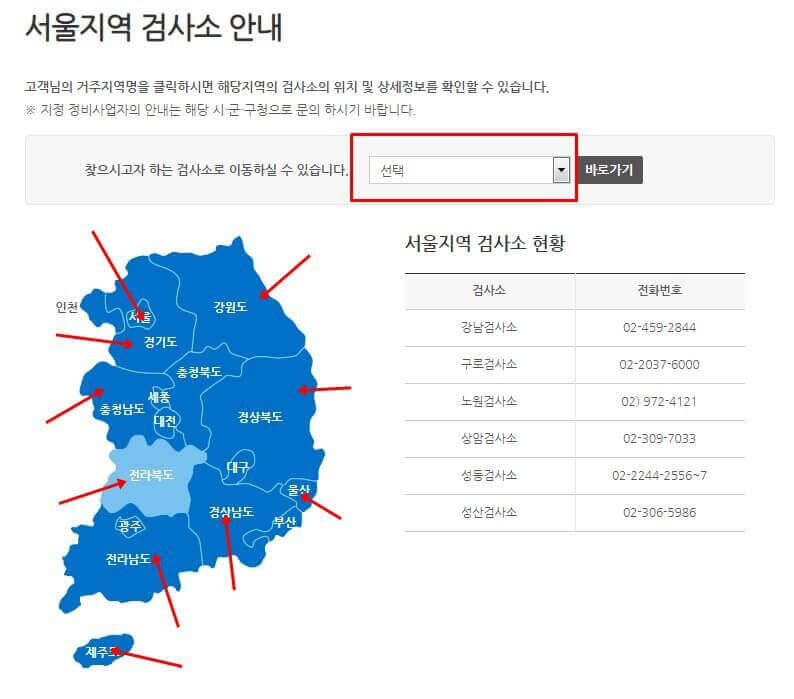 홈페이지에 접속하여 ‘자동차 검사소 찾기’ 메뉴를 클릭하면, 지역별로 검사소 목록과 위치를 확인할 수 있습니다.