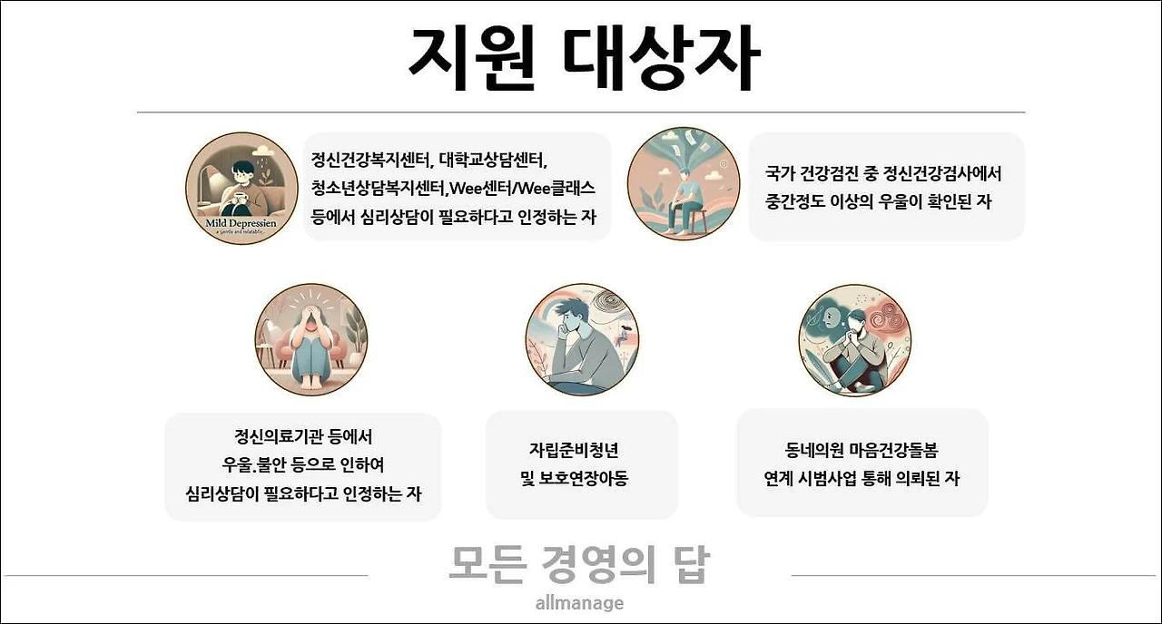 이 사업의 지원 대상은 우울증, 불안장애 등 정서적 어려움을 겪고 있는 모든 국민입니다. 특히, 심리 상담이 필요한 상황에 처한 분들이라면 누구나 신청할 수 있습니다. 자격 요건은 간단합니다. 만 19세 이상의 성인으로, 심리 상담이 필요하다고 판단되는 경우, 해당 서비스를 이용할 수 있습니다. 또한, 건강 검진을 통해 심리적 지원이 필요하다고 확인된 경우에도 지원을 받을 수 있습니다.