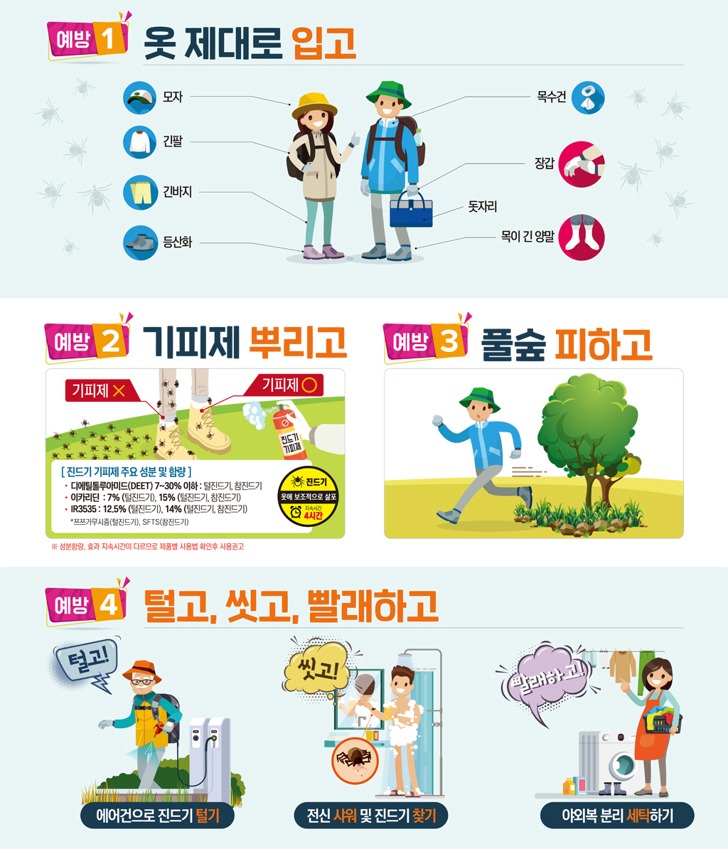 진드기 물림을 예방하기 위해서는 다음과 같은 조치를 취할 수 있습니다.