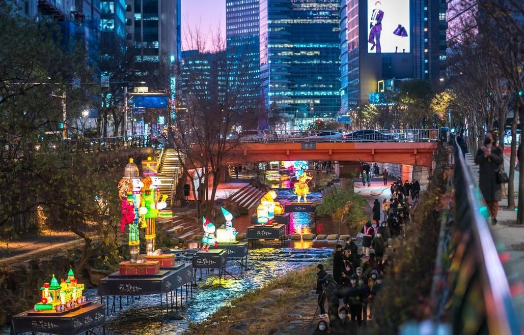 매년 겨울, 청계천은 환상적인 빛의 축제로 변모합니다.