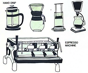 커피를 추출하는 방식에는 크게는 핸드드립 방식과 에스프레소 방식으로 나눌 수가 있다. 핸드드립이란 뜨거운 물을 떨어트려 커피의 성분을 용해시켜 침물, 여과시키는 것을 말하고 에스프레소는 에스프레소 머신을 이용해 수증기의 높은 압력을 가압하여 20~30초의 단시간동안에 농축된 커피성분을 추출하는 커피를 뜻한다. 커피를 추출할대에는 커피의 양,분쇄입자,추출시간,온도등 커피의 맛과 향에 영향을 주는 요소들을 고려해야 한다.