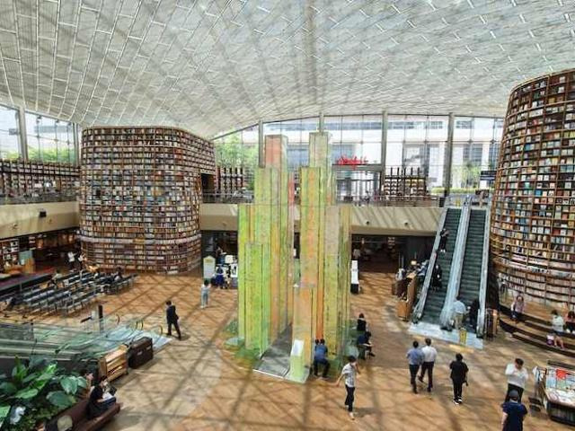 도서관 내부는 정말 아름다워요. 기둥처럼 서 있는 책장과 중앙에 있는 유리 설치물은 멋진 포인트랍니다. 이곳에서는 정말 다양한 장르의 책을 찾아볼 수 있고, 편안한 독서 공간도 마련되어 있어서 사람들이 자유롭게 책을 읽고 있어요.