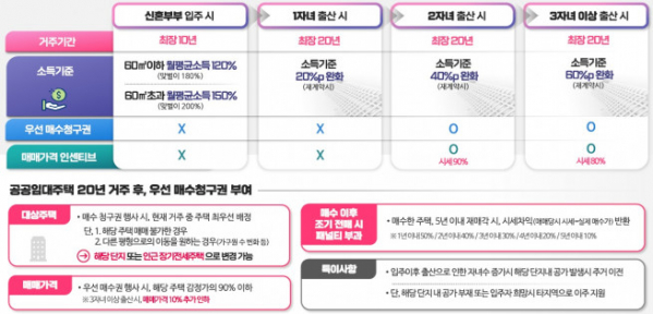 이들 주택은 신혼부부뿐만 아니라 예비부부도 입주할 수 있으며, 자녀 출산 시 거주 기간 연장과 우선 매수청구권 부여 등의 혜택을 제공합니다.